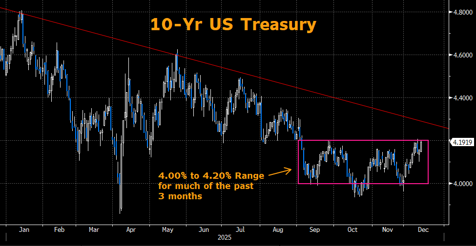 Markets remain range-bound: the S&P has remained just below October’s all-time high of 6,920, leaving my 7,000-year-end target within reach but elusive. There remain a few more shopping days until Christmas; thus, the Santa Rally, which has yet to arrive, may still materialize. Rates are anchored, with 10-year yields between 4.00% and 4.20%, while the 2-year Note stays above 3.50%, echoing expectations for limited near-term easing.