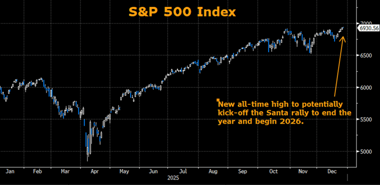 Rates held in a tight range last week, while equities climbed, with the S&P 500 setting a fresh record and edging closer to our 7,000 year-end target. This momentum hints at the start of a Santa rally, potentially closing out the year and ushering in the new one on a positive note.