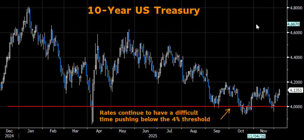 News out of Washington suggests that President Trump has already settled on his choice to replace Powell as Chair of the FOMC, fueling speculation that Kevin Hassett is the leading candidate. Despite Hassett’s well-known dovish leanings, the bond market appears reluctant to chase lower yields, as rates held above the 4% threshold and generally trended higher throughout the week. This hesitation likely reflects the Committee’s current divide. Some members are signaling an imminent rate cut while others favor holding the Fed Funds rate steady at Wednesday’s meeting, keeping downward pressure on longer-end yields muted.