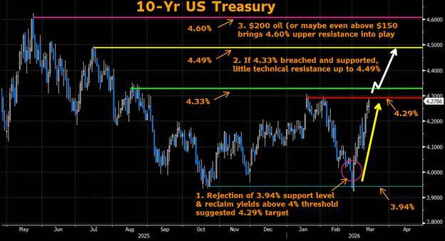 Looking forward, interest rates are likely to track the volatility of oil. Technical levels suggest notable resistance slightly above the current range, and from a purely technical perspective, once the 4.33% level is breached and supported, there is limited impediment to a further move toward 4.49% - particularly if crude prices resume climbing and break above the previous ~$120 per‑barrel peak. Should this breakout occur, I plan to increase short exposure to capitalize on the next leg higher.