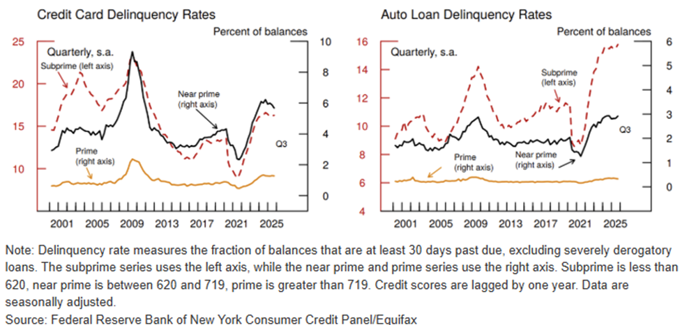 This increased reliance on borrowing has come at a cost. Delinquency rates on credit cards and auto loans climbed to multi-year highs, with subprime segments showing the sharpest deterioration. Rising interest rates earlier in the year compounded repayment burdens, while tighter liquidity left vulnerable borrowers exposed. The uptick in defaults and late payments signals mounting financial stress, raising concerns about spillover effects on consumer confidence and broader economic stability.