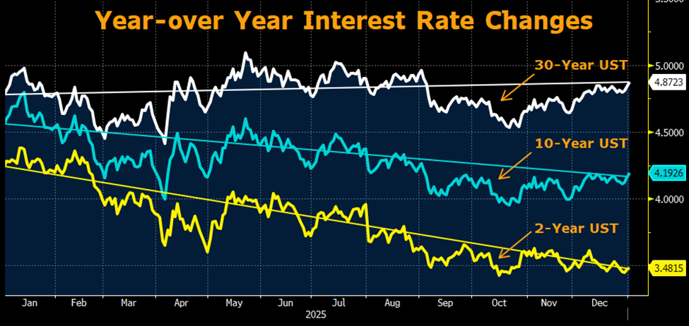 Throughout 2025, U.S. interest rates reflected a notable shift in monetary policy as the Federal Reserve revisited a more accommodative approach following 100 basis points of cuts in 2024. These actions contributed to a steepening trend in the yield curve, as short-term rates fell while long-term yields remained anchored, reflecting persistent structural risks.