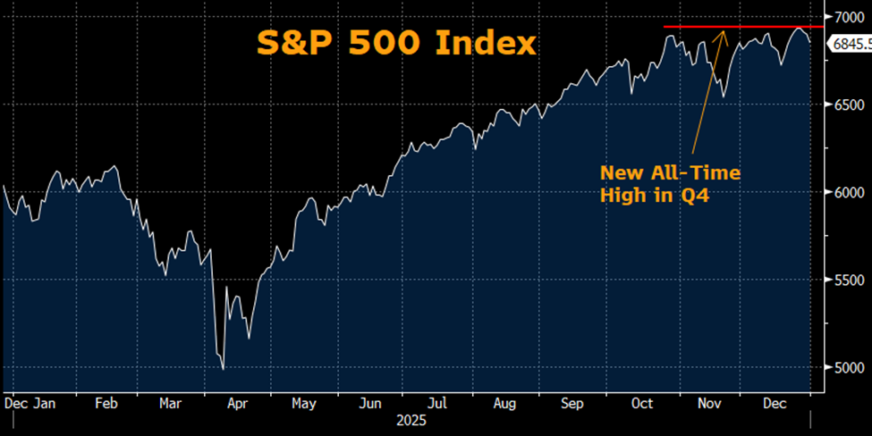 Equities continued to climb to record levels in the fourth quarter, with the S&P 500 closing just above 6,850, capping a nearly 16% return following the previous 2 years of nearly 25% returns. Despite headwinds, the market demonstrated incredible resilience, supported by robust earnings growth. Lingering concerns about stretched valuations, macroeconomic uncertainty, and technical factors persisted, but a pullback failed to materialize.